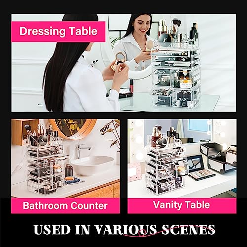 - Material acr?lico: los organizadores de maquillaje acr?licos son suaves y texturizados, lo que hace que nuestros aparadores sean hermosos y ordenados; el material acr?lico es impermeable y se puede utilizar en el ba?o y la encimera organizadora de maquillaje