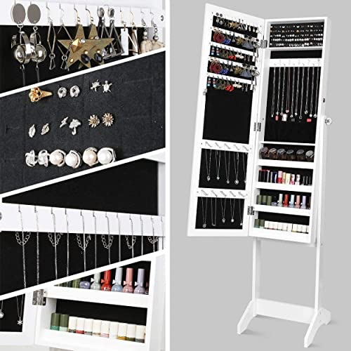 • Almacenamiento de joyas: el espejo joyero de pie tiene una gran capacidad de almacenamiento, equipado con m?ltiples compartimentos y ganchos, que pueden contener aretes, collares, anillos, pulseras, etc., y el forro de terciopelo puede evitar que las joyas se rayen.