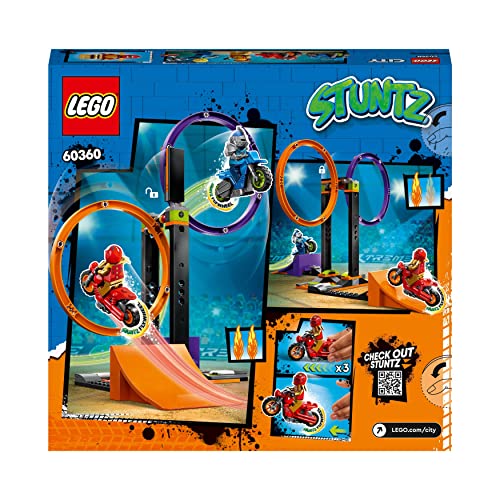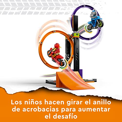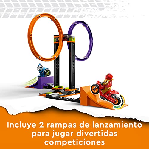 - Este set de construccion de LEGO City Stuntz incluye 2 anillos giratorios, 2 rampas y 2 motos de juguete con retro friccion para que los ninos puedan organizar competiciones de 1 o 2 jugadores
