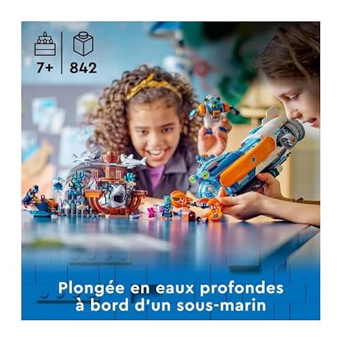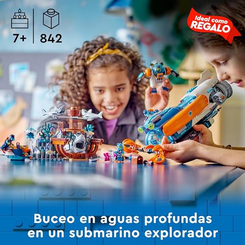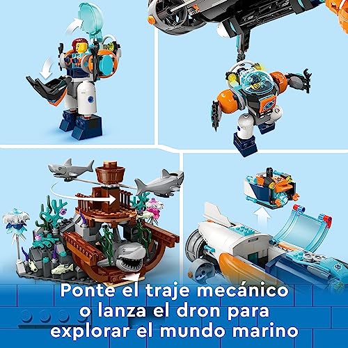 - El Submarino Explorador de las Profundidades Marinas de LEGO City para ninos a partir de 7 anos incluye un decorado de un naufragio protegido por tiburones y mucha equitacion para escenificar emocionantes aventuras subacuaticas