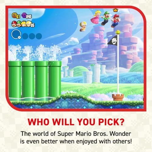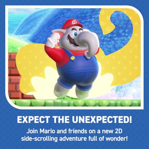 - Pick from heroic Super Mario characters – including Mario, Luigi, Peach, Daisy, Yoshi and Toad. Transform into Elephant Mario to use your trunk to trounce enemies with a surprising new Power-Up! Share the wonder with friends and Mario fans – Team up with up to three friends locally and gather around one Nintendo Switch console to experience the game-bending Wonder Effects together as you tackle courses as a team, and help each other on your way to the goal.*