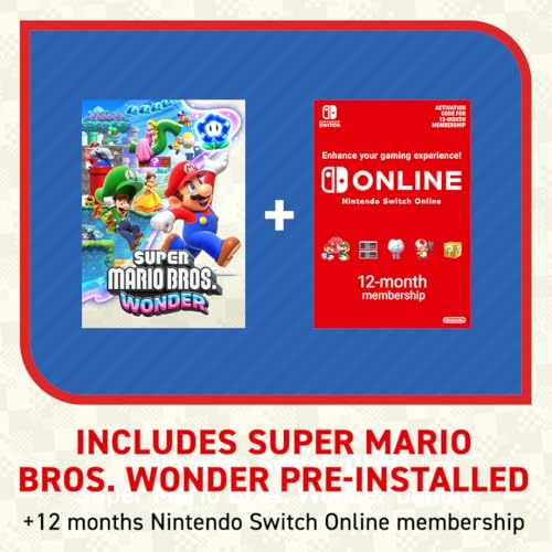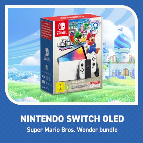 - 12-month Nintendo Switch Online Individual Membership Play online** with friends and family. Discover (or rediscover) classic NES, Super NES and Game Boy games.What’s in the box: Nintendo Switch Oled Model with Super Mario Bros. Wonder pre-installed x1, 64 GB total system storage, part of which is reserved for system data. Nintendo Switch dock x1, Joy-Con (L) White x1, Joy-Con (R) White x1, Joy-Con grip x1, Joy-Con strap x2, HDMI cable x1,