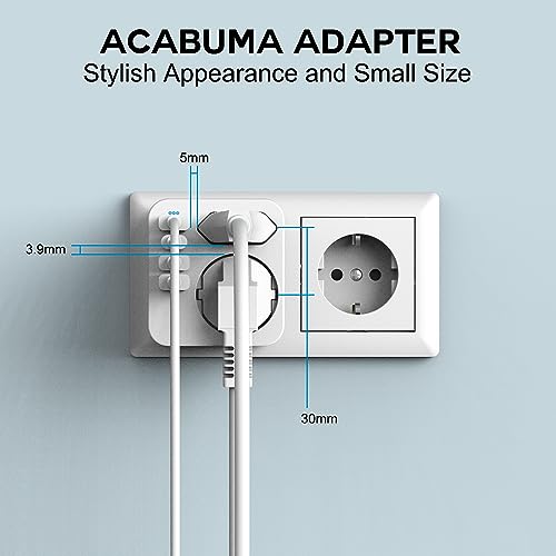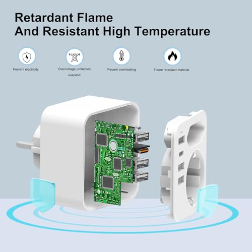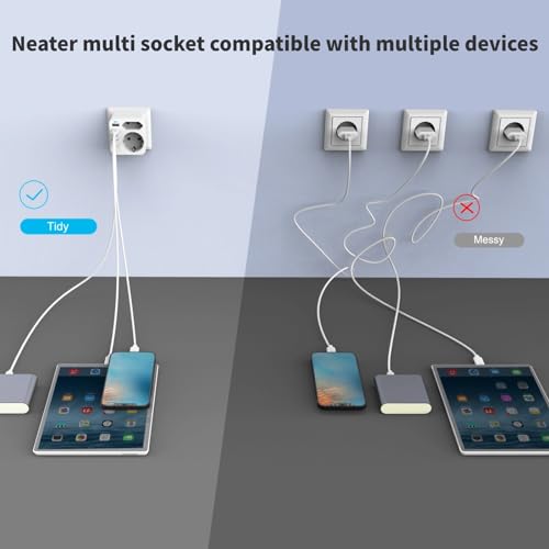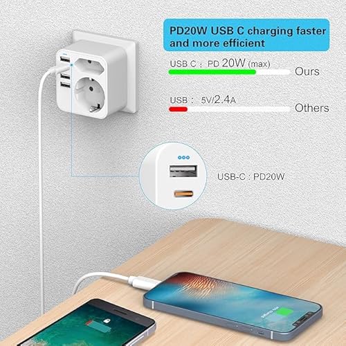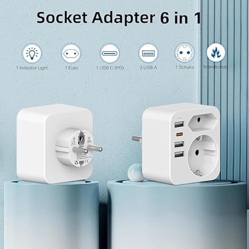 - 6 en 1 enchufe m?ltiple: el enchufe de doble enchufe dispone de 2 enchufes Schuko (E/F) + 1 tipo C + 3 puertos USB. Doble enchufe con USB puede cargar 6 dispositivos al mismo tiempo. El enchufe m?ltiple sin cable del adaptador es m?s pr?ctico que los enchufes de pared. As? que no te preocupes de que no tengas suficiente toma USB C.