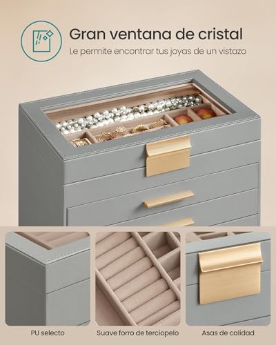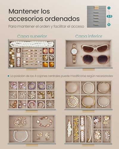 - [Almacenamiento de 6 niveles] Guarda tus accesorios de forma ordenada en esta caja de joyas. Las joyas peque?as se guardan en los 5 compartimentos de diferentes tama?os, las gafas de sol y los relojes est?n en el caj?n grande del fondo