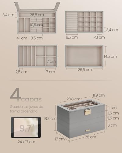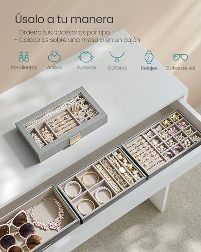 - [Vers?til] Esta caja joyero con 4 bandejas extra?bles puede colocarse en el tocador del dormitorio, en cajones o en el vestidor, por lo que resulta pr?ctico para combinar pendientes, collares, anillos, pulseras, broches y otros accesorios