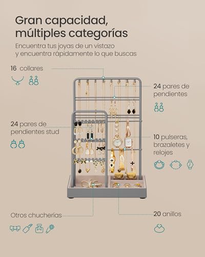 - [Gran capacidad, m?ltiples] Los agujeros y ranuras del joyero caben 24 pares de pendientes stud o aros; las 2 varillas abiertas caben 10 pulseras, brazaletes o relojes; los ganchos caben 16 collares; la base cabe anillos, pintalabios, broches, horquillas