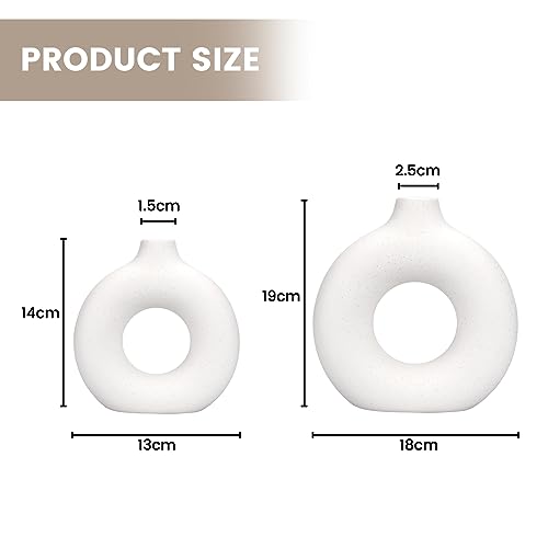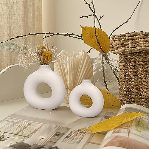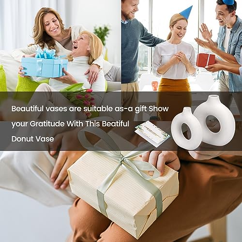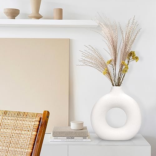 - ?APARIENCIA ELEGANTE Y ART?STICA: Nuestros jarrones cer?mica con forma de dona tienen una apariencia hermosa y moderna,y est?n dise?ados con un dise?o ?nico que es diferente del jarr?n tradicional.El jarr?n redondo con centro hueco lo convierte no solo en un jarr?n de flores, sino tambi?n en una obra de arte,Dise?o abstracto simple y ?nico que hace que el jarr?n sea hermoso con y sin flores, aporta un aspecto elegante y art?stico a su hogar que se mantiene fiel a la est?tica de la habitaci?n.