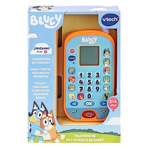 - SEIS BOTONES DE PERSONAJES para descubrir an?cdotas de Bluey y su familia. ?A bailar!: Escucha las melod?as del tel?fono mientras los personajes bailan en la pantalla. ?Atrapa la fruta!: Bluey est? jugando a ser un murci?lago de la fruta. ?Ay?dala a conseguir fruta! Haciendo el pino: Pulsa los botones a tiempo para que Bingo haga el pino sin caerse. ?Burbujas!: Sopla hacia el micr?fono para crear tantas burbujas como puedas. ?A charlar!: ?Juega a hablar con Bluey y Bingo gracias a la activaci?n por voz! Mensajes de voz: ?Escucha los mensajes de Bluey y Bingo sobre su familia y sus amigos!