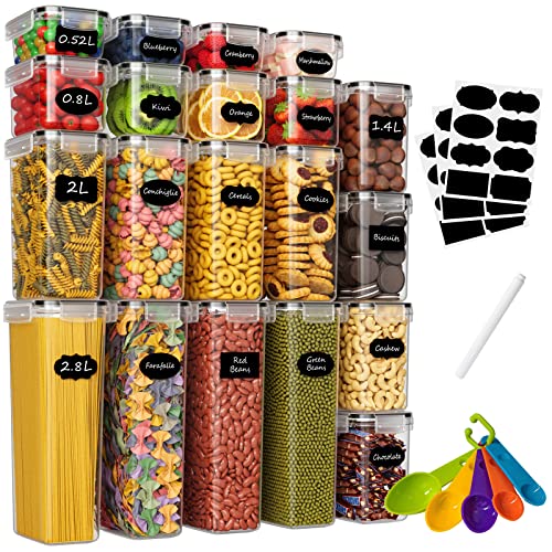• Juego de 20 tarros de almacenamiento con tapa: caja de almacenamiento de cereales para cocina contiene 2,8 L (4 unidades), 2 L (4 unidades), 1,4 L (4 unidades), 0,8 L (4 unidades), 0,52 L (4 unidades), se almacena con 24 etiquetas ?tiles para etiquetar el alimento, 1 bol?grafo y 5 cucharas medidoras.