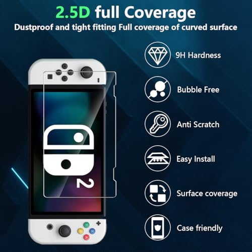 - DUREZA 9H: Nintendo Switch 2 Protector esta hecho de vidrio premium de dureza 9H, que evita que la pantalla se agriete cuando el dispositivo se cae y protege la pantalla de aranazos de cuchillos, llaves y otros objetos afilados, proporcionando un escudo solido para la pantalla del dispositivo